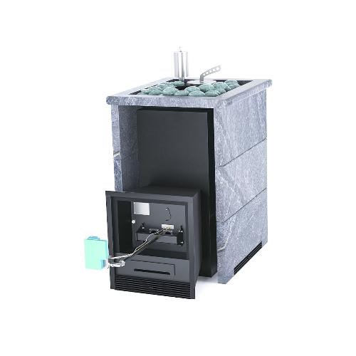 Банная печь ИзиСтим Анапа в трехстороннем кожухе Талькохлорит с открытым верхом и газовой горелкой (ГГУ-40)