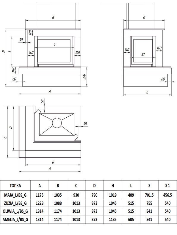 Инструкции, чертежи, документы - Каминная облицовка FireBird Онега (для топки Zuzia/LP/BS/G) (угловое стекло слева-справа, гильотина)