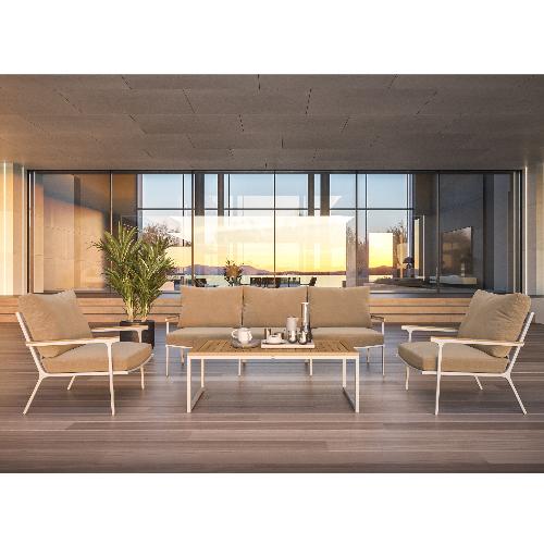 Особенности: подлокотники и планки столешницы из благородного тика, уличная ткань (олефин), съемные чехлы подушек на "молнии", дополнительно можно приобрести комплект защитных чехлов