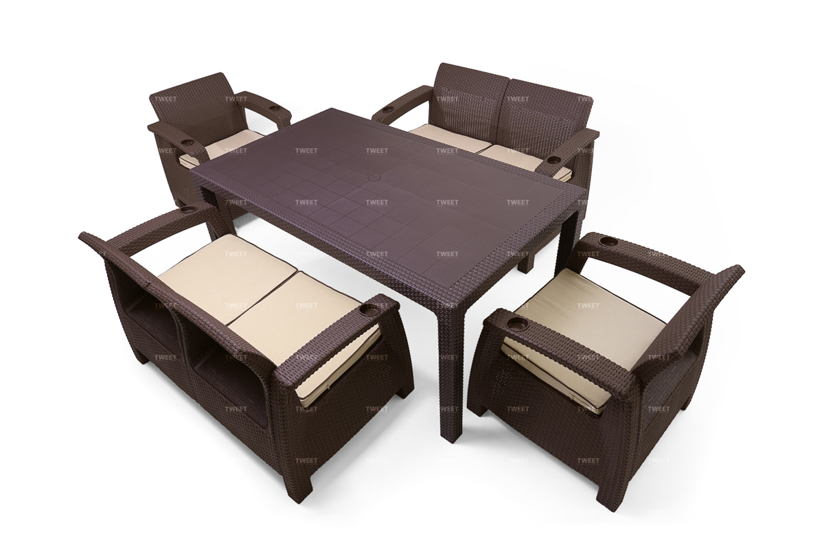 Самый большой комплект из всей линейки мебели от TWEET. Наилучшее соотношение цена/качество/количество - комплект садовой мебели TWEET Family Set из 2-х кресел, 2-х диванов и обеденного стола. Набор цвета Венге с бежевыми подушками позволит с комфортом разместить 6 человек одновременно.