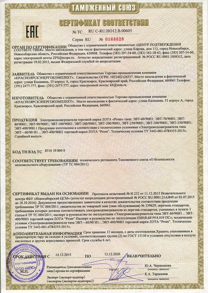 Инструкции, чертежи, документы - Электрический котел Zota Prom 60