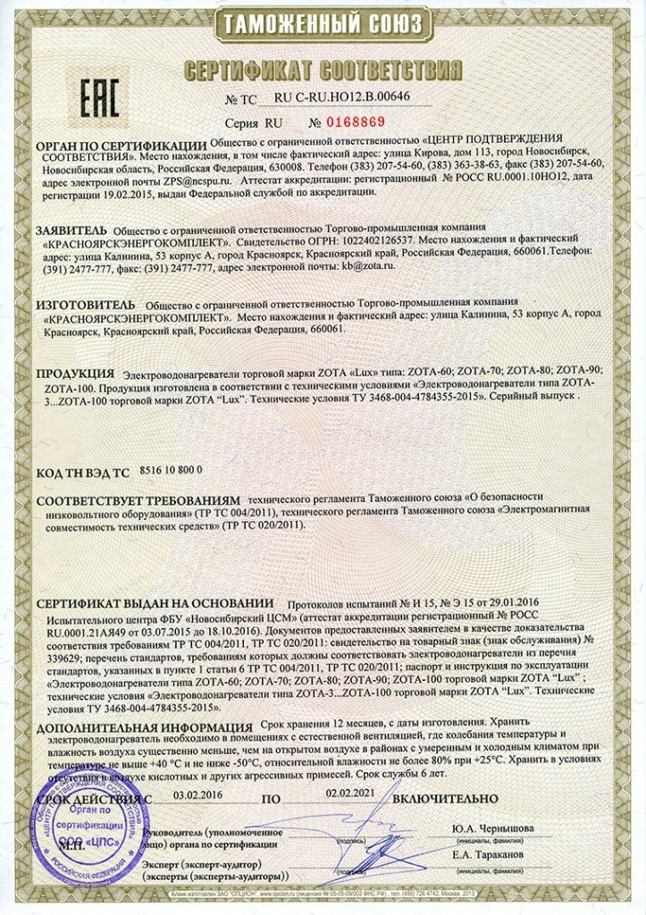 Инструкции, чертежи, документы - Электрический котел Zota Lux 90