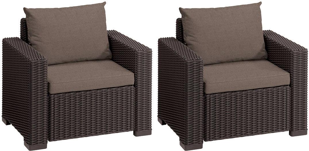 С ранних утренних часов до позднего ночного времени Вы можете отдыхать и расслабляться в комфортном кресле Калифорния. Стильная текстура, имитирующая ротанговое плетение, исключительно широкие подлокотники, подушки сиденья и спинки - благодаря им это кресло идеально подходит для того, чтобы отдыхать в летний день. А поскольку оно изготовлено из устойчивого к погодным условиям пластика с защитой от ультрафиолетового излучения, Вы будете им наслаждаться на протяжении многих сезонов, не заботясь об уходе.