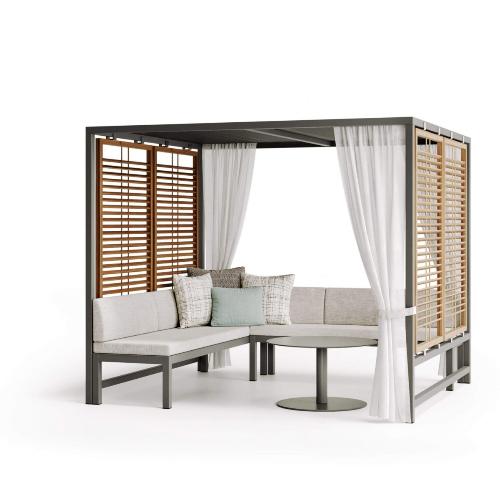 Alcova Lounge – это шатер с лаунж-мебелью из высококачественных материалов. Гармоничная и элегантная модель создает эксклюзивные зоны под открытым небом, в которых можно наслаждаться природой в полном комфорте. Он станет идеальным решением для обустройства зон отдыха возле бассейнов, на пляжах, а также подойдет для отелей, летних кафе и террас ресторанов. Каркас всей конструкции изготовлен из прочного и надежного алюминия, что обеспечивает долгий срок службы, а диваны с мягкими подушками и шатер, защищающий от палящих лучей солнца – максимально приятные условия релаксации.