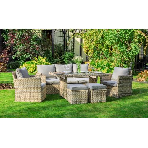 Мягкие подушки светло серого цвета с чехлами из водоотталкивающей ткани добавляют удобства и стиля. Вам не придется скрывать подушки при дожде. Особенностью гарнитуры является ручное плетение техноротанга в бежевом цвете, что придает ей современный и лаконичный вид, вписываясь идеально в любое окружение - будь то уединенный приусадебный сад или уютная терраса перед домом. Надежность и Долговечность Комплект обладает металлическим каркасом, который обеспечивает прочность и устойчивость к высоким весовым и механическим нагрузкам. При этом, мебель остается легкой для удобного перемещения с места на место. Она не только устойчива к воздействию влаги, но и выдерживает прямой контакт с водой (осадками). Декоративная отделка предметов не выгорает на солнце и сохраняет свои качества даже при резких температурных перепадах. Примечание: Держатели и крепления подушек зависят от поставки и не являются неотъемлемой частью комплекта. Садовая мебель ZOYA - это гармония стиля и комфорта для вашего отдыха на свежем воздухе. Позвольте себе наслаждаться природой и приятными моментами в кругу семьи с этим прекрасным комплектом садовой мебели.