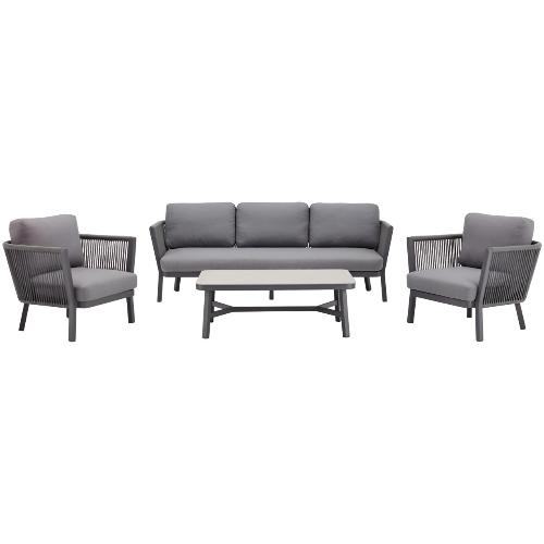 Комплект уличной мебели для отдыха Sofia обладает гармоничным стилем и разнообразными вариантами комбинирования, позволяющими наслаждаться жизнью на свежем воздухе. Коллекция, выполненная в сером цвете, состоит из разных оттенков сочетания фактуры металла, плетения из роупа и обивки, которые делают мебель намного более многослойной и легкой.