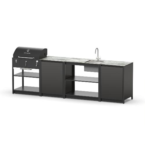 Уличный барбекю комплекс из четырех модулей закрытого типа с угольным грилем, столешницей и мойкой.