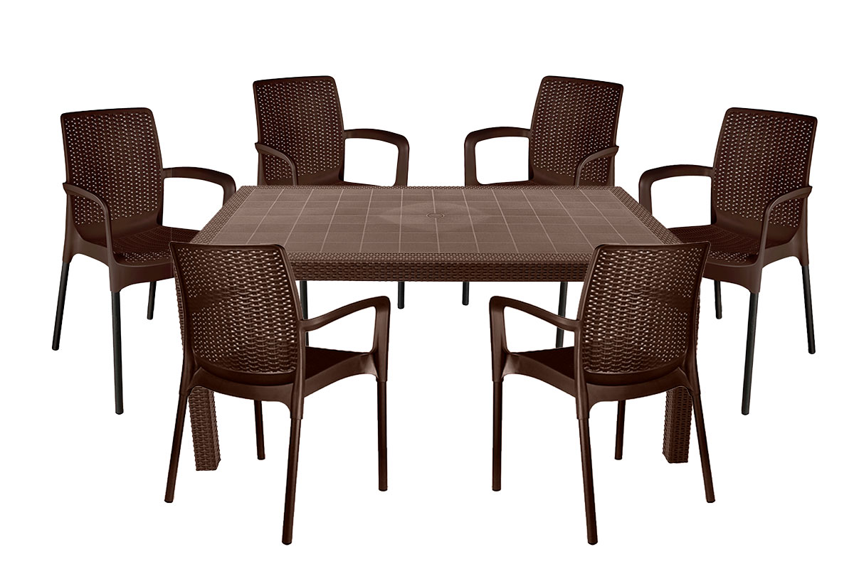 Комплект от российского производителя Gardeck включает 6 стульев с подлокотниками, металлическими ножками и 1 обеденный стол, идеально подойдёт для оформления садового участка, позволяет с комфортом разместиться Вам и Вашим гостям на террасе или балконе в количестве 6 человек.