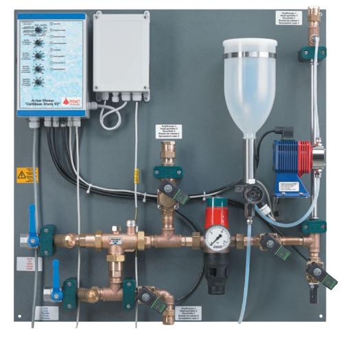 Полная коммутация и предварительный монтаж на синей полипропиленовой пластине всех управляющих компонентов душа.