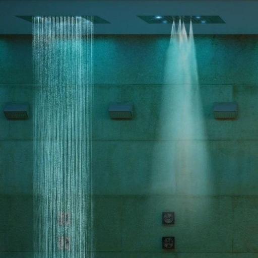 Программа 1: Тропический дождь Программа начинается с теплого мелкого дождя. Зеленое освещение отключается, и по кабине распространяется красный свет. Слышится пение птиц. Затем начинается ливень. Душевая кабина заполняется фруктовым ароматом. Свет меняется на желтый. После этого в целях охлаждения включается холодный моросящий дождь. Освещение попеременно меняет цвет с желтого на зеленый. Затем холодный моросящий дождь прекращается, и программа запускает теплый мелкий дождь и ливень с ароматом. Желто-зеленое освещение меняется на красно-зеленое