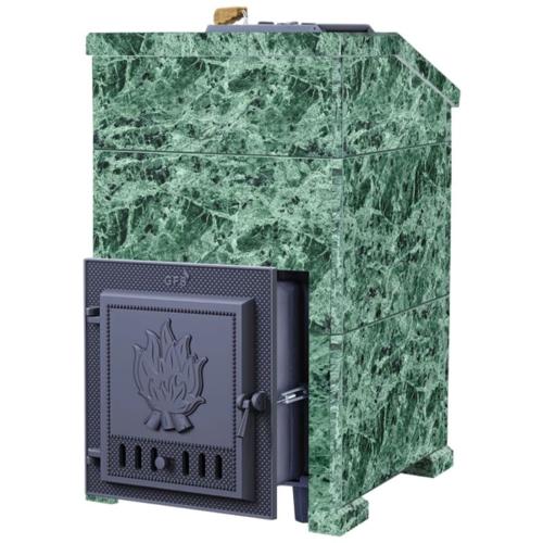 Поток Б, поступает через колосниковую решетку в нижнюю часть первой камеры. Поток В по отдельному воздушному каналу попадает во вторую камеру дожига расположенную под каменкой печи. Здесь он смешивается с огнем, вызывая активное горение пиролизных газов и резкий рост температуры. Это позволяет менее чем за 1 час нагреть массивную каменку с закладом до температур свыше 600С. Каменка находится внутри топки и нагревается прямым огнем со всех сторон. Огромный запас тепла в такой каменке делает печь «незаливаемой». На камни можно лить воду для получения мелкодисперсного и легкого пара в количествах, многократно превышающих стандартные нормы для парных помещений. Без такого пара невозможно создать микроклимат настоящей Русской Бани.