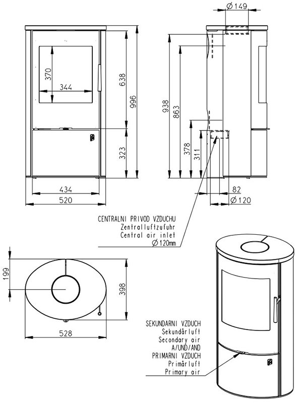 высота: 996 мм, ширина: 528 мм, глубина: 398 мм.
