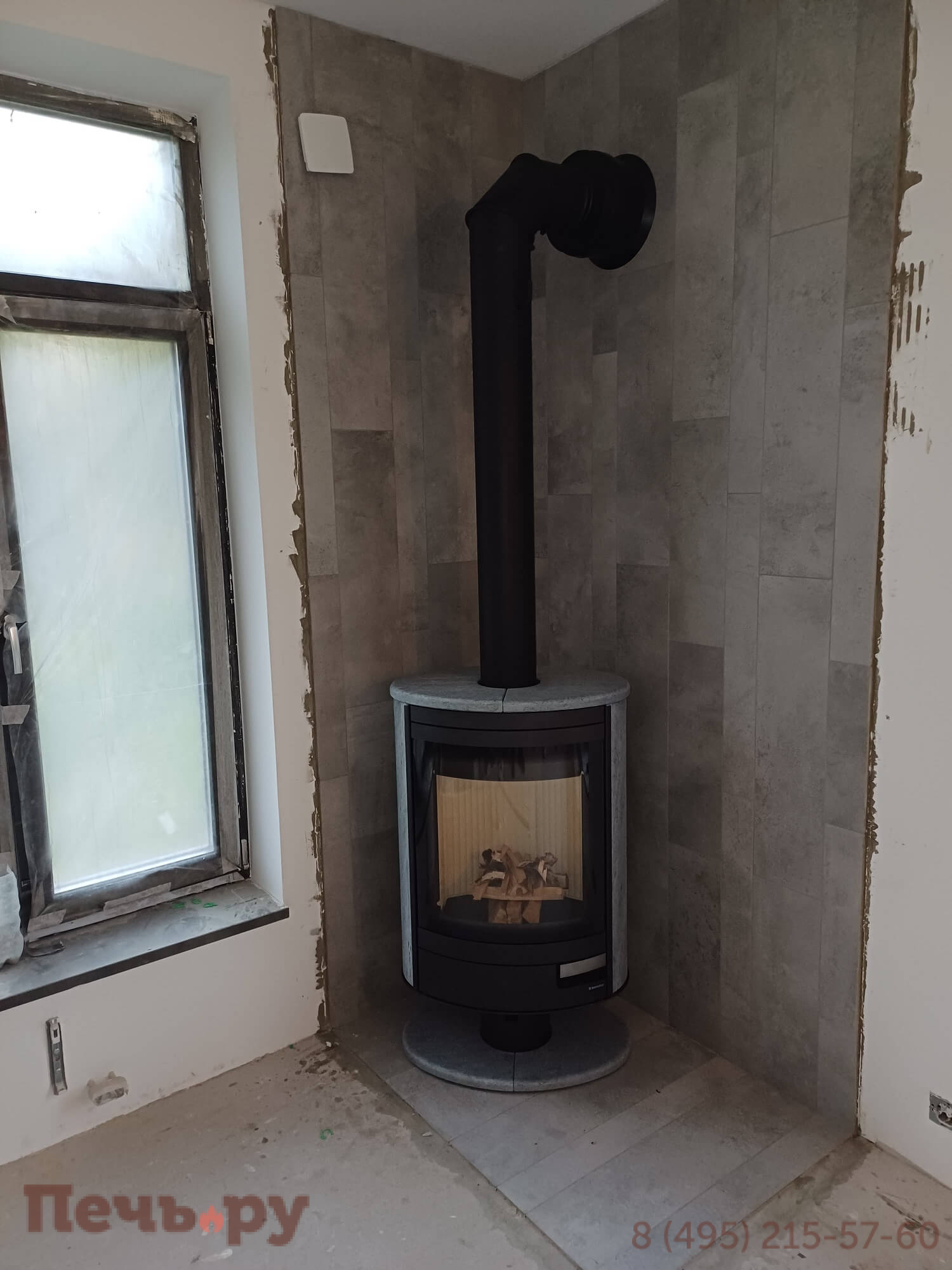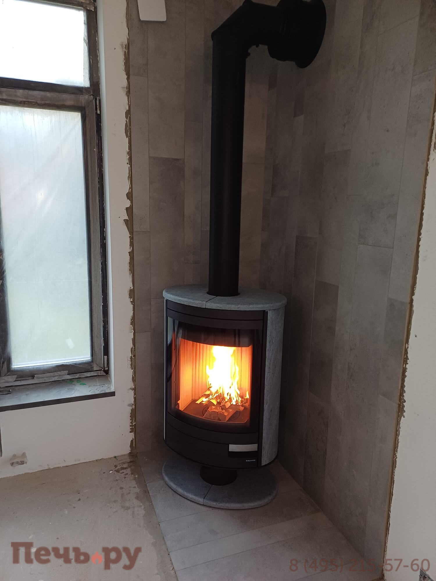 Топка вращается вокруг дымохода, поэтому он подключается только сверху. Диаметр дымохода распространённый – 150 мм. Печь-камин N спроектирована как пристенная, но при желании вы можете поместить её в центр комнаты и смотреть на огонь с разных точек пространства. Вертите топку, как нужно: фасадом то к столу с гостями, то к дивану или креслу, то к входу в помещение. И всякий раз огонь будет восприниматься по-новому. Возможность поворачивать камин придётся очень по вкусу любителям перестановок.