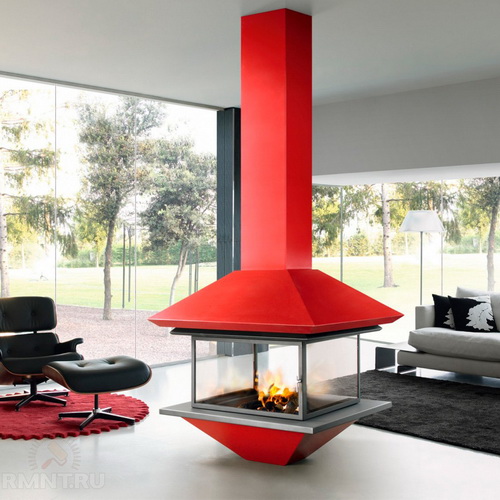 Интересно поместить камин необычной формы в самую сердцевину строгого и сухого интерьера. Тогда он станет главным «действующим лицом» вашей комнаты, все взгляды будут обращены на него, особенно если внутри топки пылает огонь!