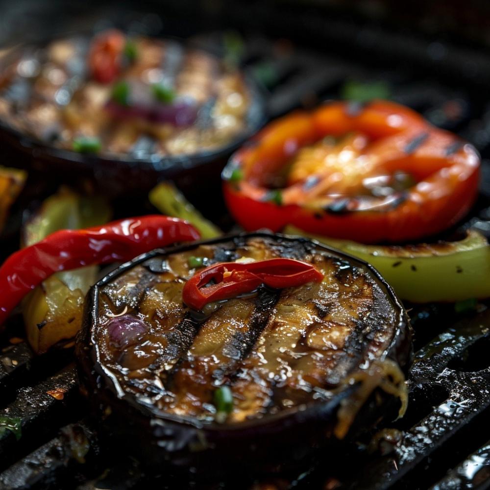 Установите решетку с овощами на разогретый гриль. Обжаривайте овощи до появления подпалин от решетки гриля.